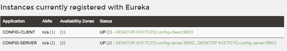 - 我们先启动相关服务,启动eureka-server,以application-amqp.yml为配置启动config-server,以bootstrap-amqp1.yml为配置启动config-client,以bootstrap-amqp2.yml为配置再启动一个config-client,启动后注册中心显示如下: