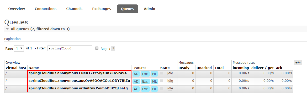 - 启动所有服务后,我们登录RabbitMQ的控制台可以发现Spring Cloud Bus 创建了一个叫springCloudBus的交换机及三个以 springCloudBus.anonymous开头的队列: