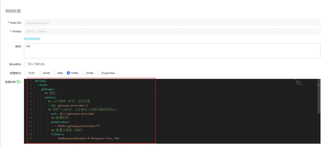 在nacos中的public命名空间中创建dataId为cloud-gateway.yaml的配置(未指定环境),配置内容如下: