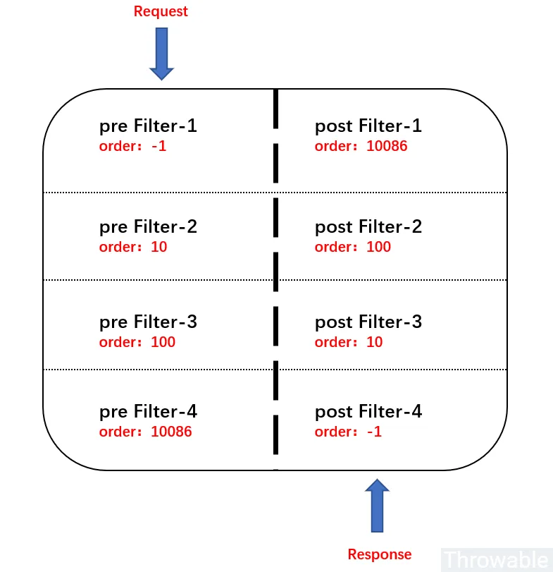 - pre类型过滤器如果order值越小,那么它就应该在pre过滤器链的顶层,最先执行。