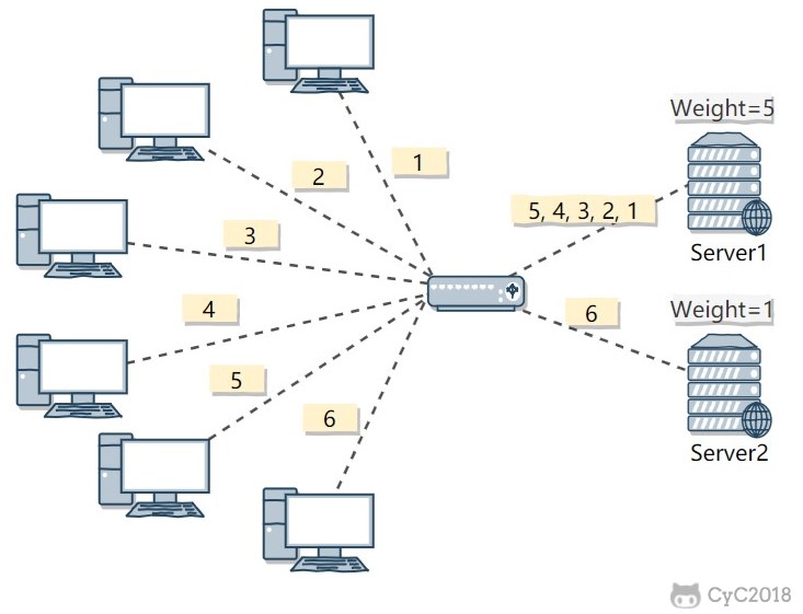 例如上图中,服务器 1 被赋予的权值为 5,服务器 2 被赋予的权值为 1,那么 (1, 2, 3, 4, 5) 请求会被发送到服务器 1,(6) 请求会被发送到服务器 2。