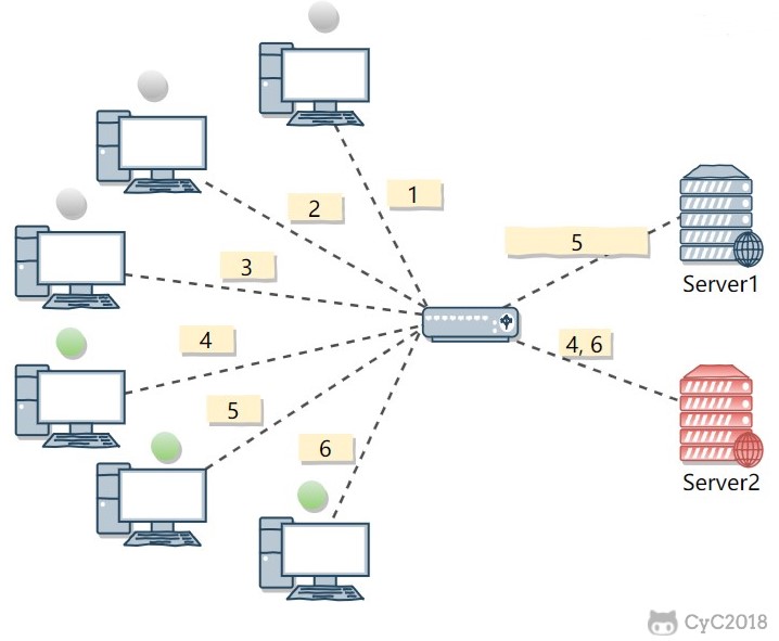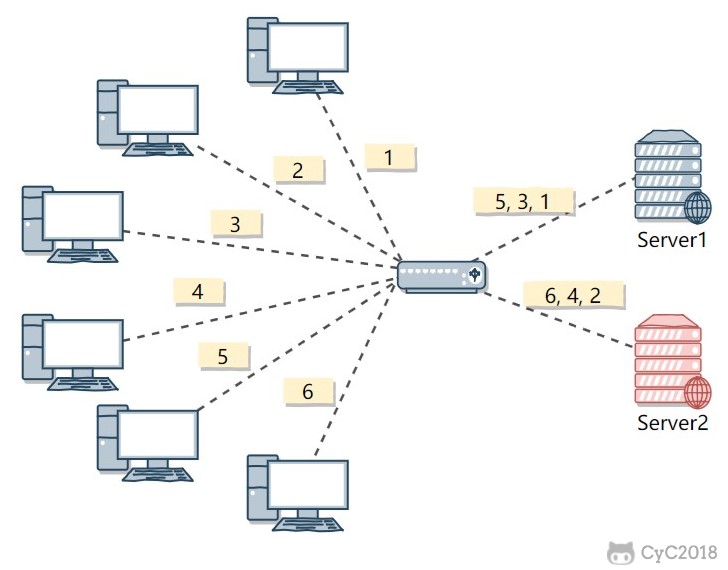 下图中,一共有 6 个客户端产生了 6 个请求,这 6 个请求按 (1, 2, 3, 4, 5, 6) 的顺序轮流发送到两个服务器。