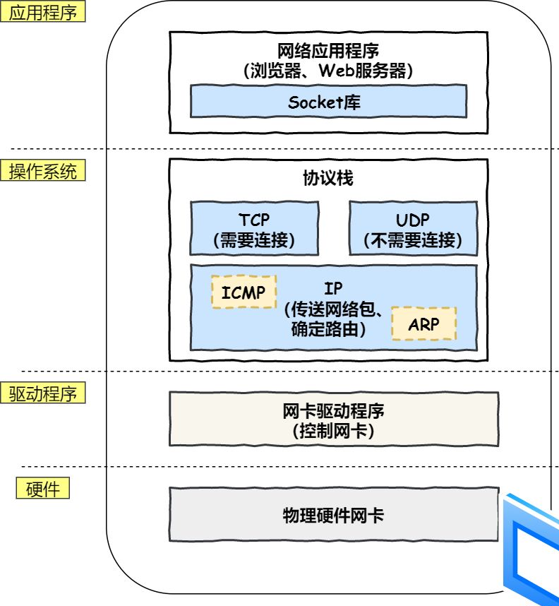 - 应用层:浏览器通过调用 Socket 库来委托协议栈工作;