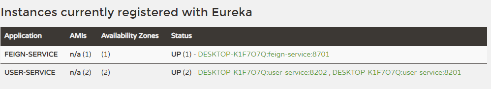 - 启动eureka-service,两个user-service,feign-service服务,启动后注册中心显示如下: