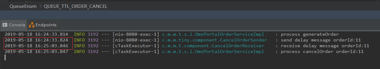 调用完成后查看控制台日志可以发现,从消息发送和消息接收处理正好相差了