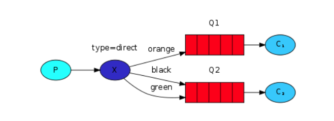 路由键都绑定到交换机,队列1的路由键为orange和black,队列2的路由键为green和black;