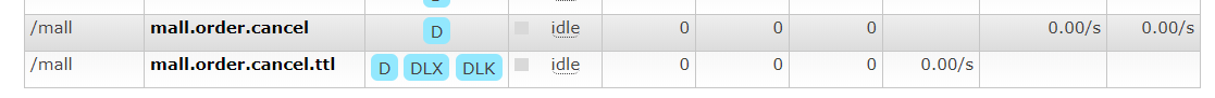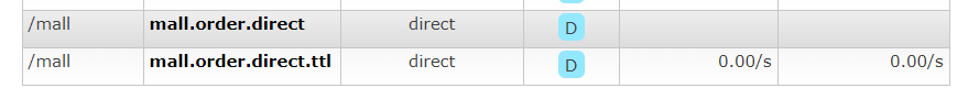 mall.order.direct(取消订单消息队列所绑定的交换机):绑定的队列为mall.order.cancel,一旦有消息以mall.order.cancel为路由键发过来,会发送到此队列。mall.order.direct.ttl(订单延迟消息队列所绑定的交换机):绑定的队列为mall.order.cancel.ttl,一旦有消息以mall.order.cancel.ttl为路由键发送过来,会转发到此队列,并在此队列保存一定时间,等到超时后会自动将消息发送到mall.order.cancel(取消订单消息消费队列)。