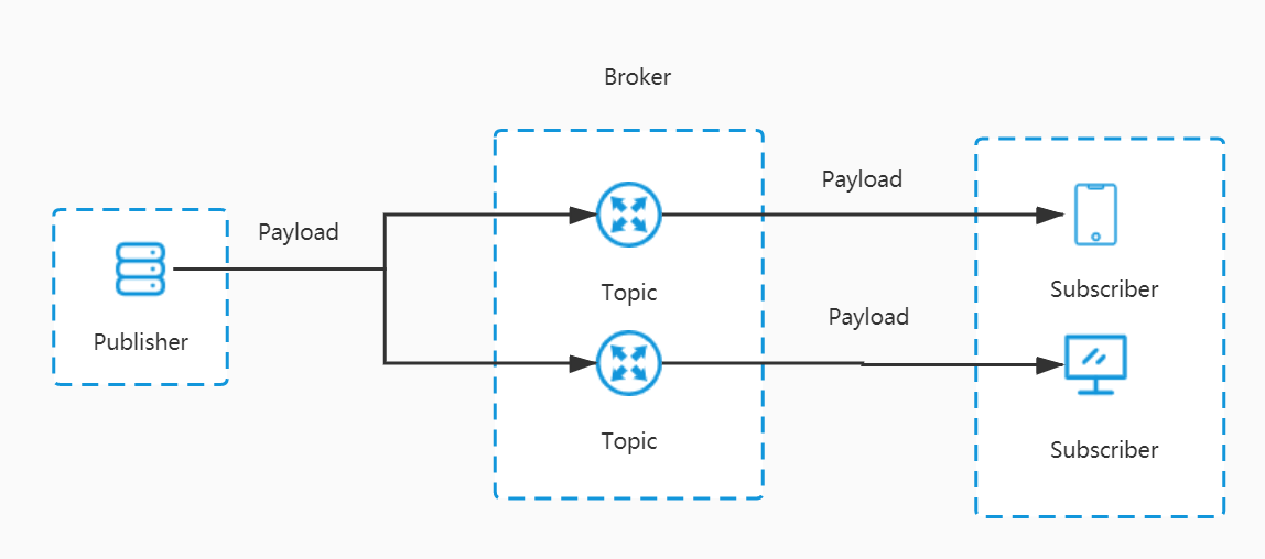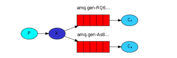 - 两个消费者同时绑定到不同的队列上去,两个队列绑定到交换机上去,生产者通过发送消息到交换机,所有消费者接收并消费相同消息。