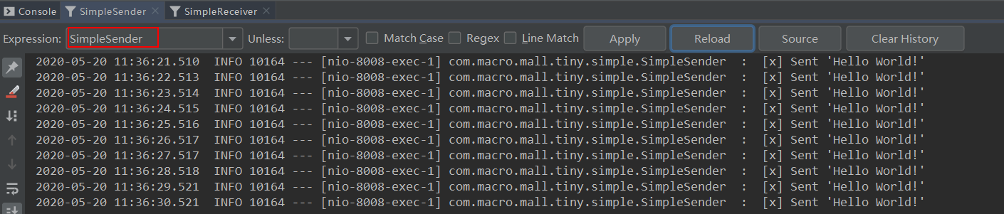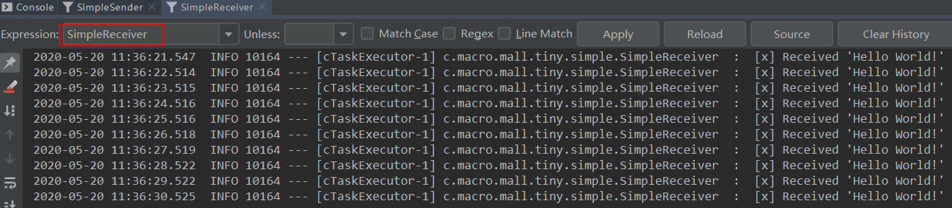 - 运行后结果如下,可以发现生产者往队列中发送消息,消费者从队列中获取消息并消费。