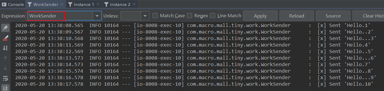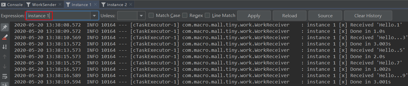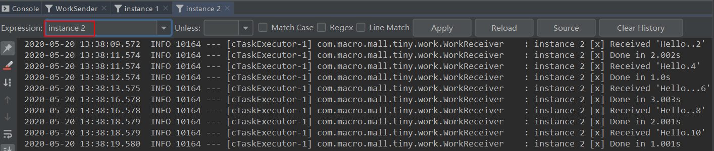 work.hello中获取消息,名称分别为instance 1和instance 2,消息中包含.号越多,耗时越长;