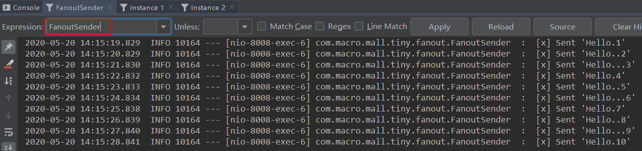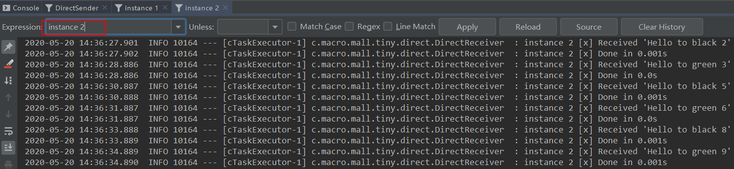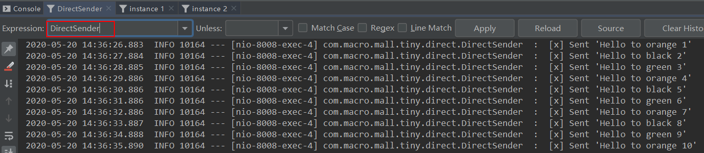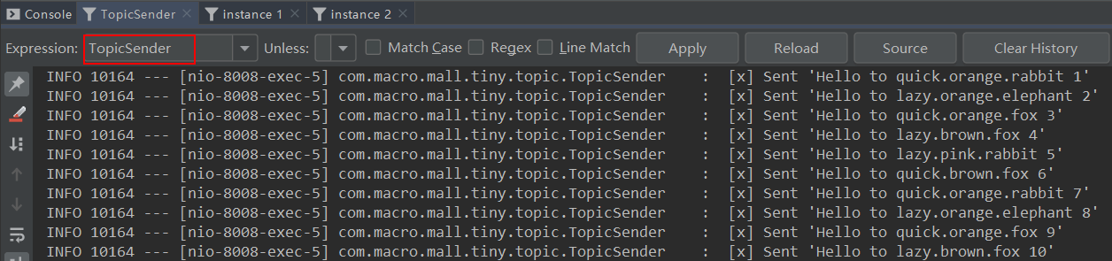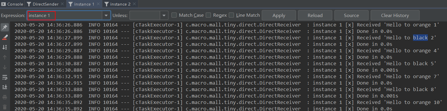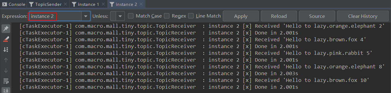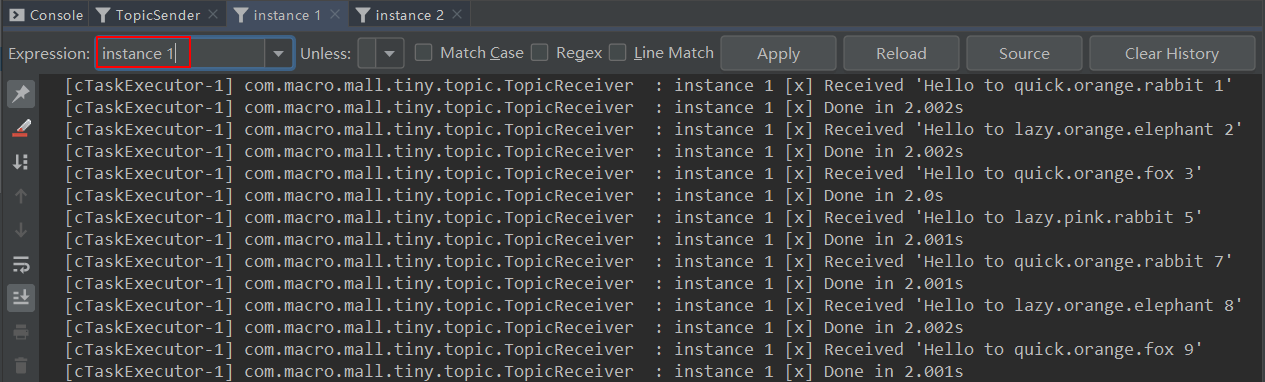 路由键的消息,instance 1和instance 2分别获取到了匹配的消息。