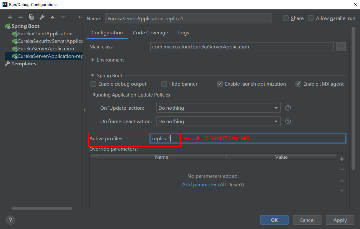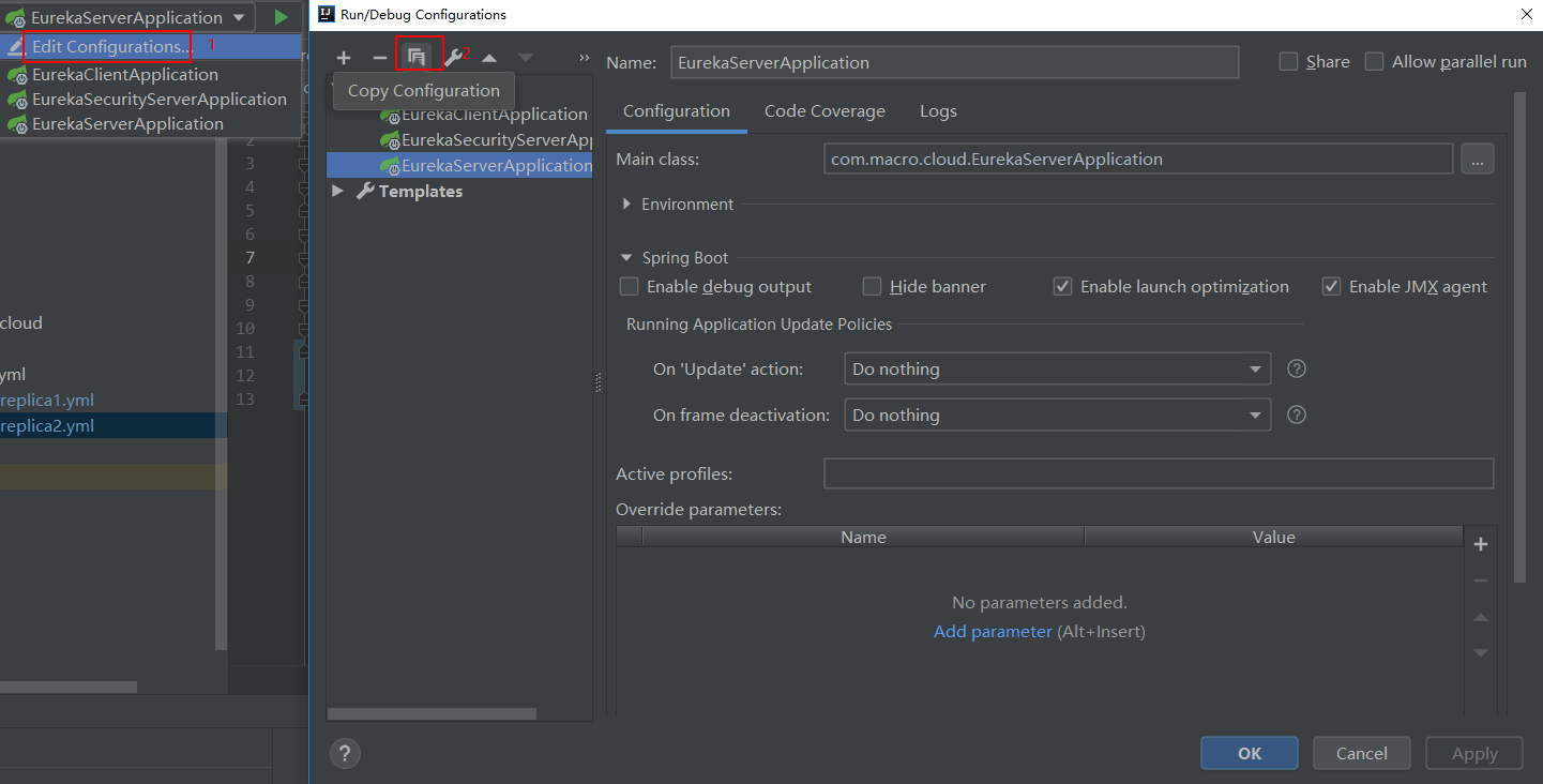 - 添加两个配置,分别以application-replica1.yml和application-replica2.yml来启动eureka-server